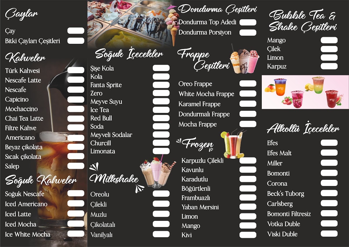 The menu offers a variety of coffee and tea selections, suitable for coffee breaks or casual visits. Visitors can find a range of hot and cold beverages commonly available in cafes, including traditional options such as sahlep, as noted by customers. Alongside drinks, light food options are likely offered to complement the beverage choices, serving as quick bites or light meals throughout the day. The menu is designed to accommodate those looking for a relaxed dining experience by the sea, providing convenient options for casual orders and light refreshments.